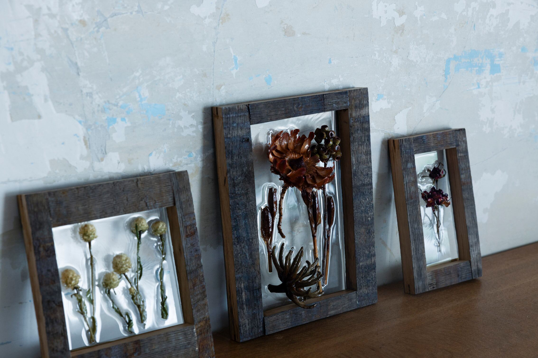 ウッドフレームの中の、ドライフラワーは花の向き、大きさにとても個性があり、表情豊かな花々ですので一番美しく見えるようにデザインして、プレート状のレジンデコールに仕上げています。