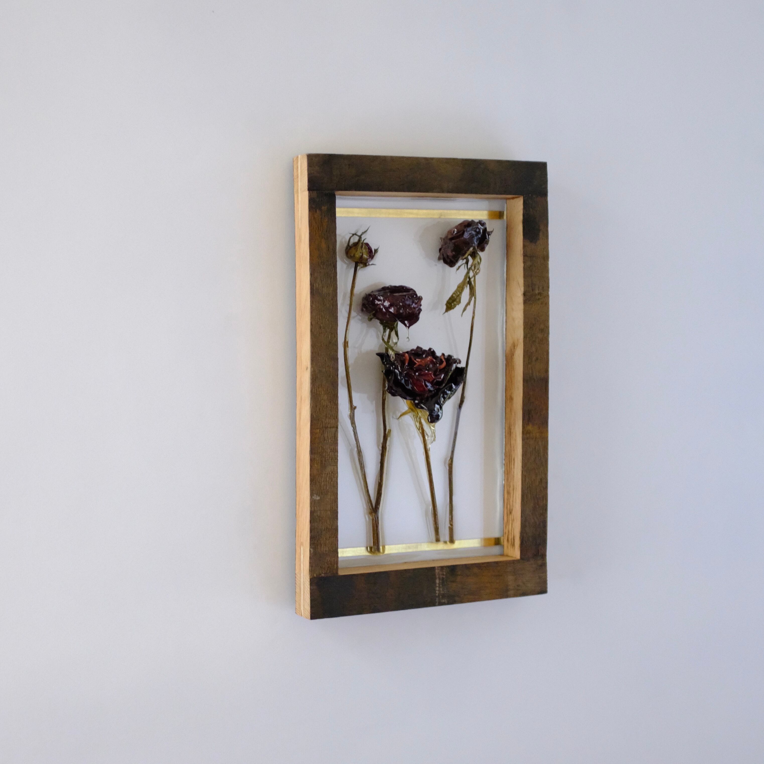 ウッドフレームの中の、ドライフラワーは花の向き、大きさにとても個性があり、表情豊かな花々ですので一番美しく見えるようにデザインして、プレート状のレジンデコールに仕上げています。