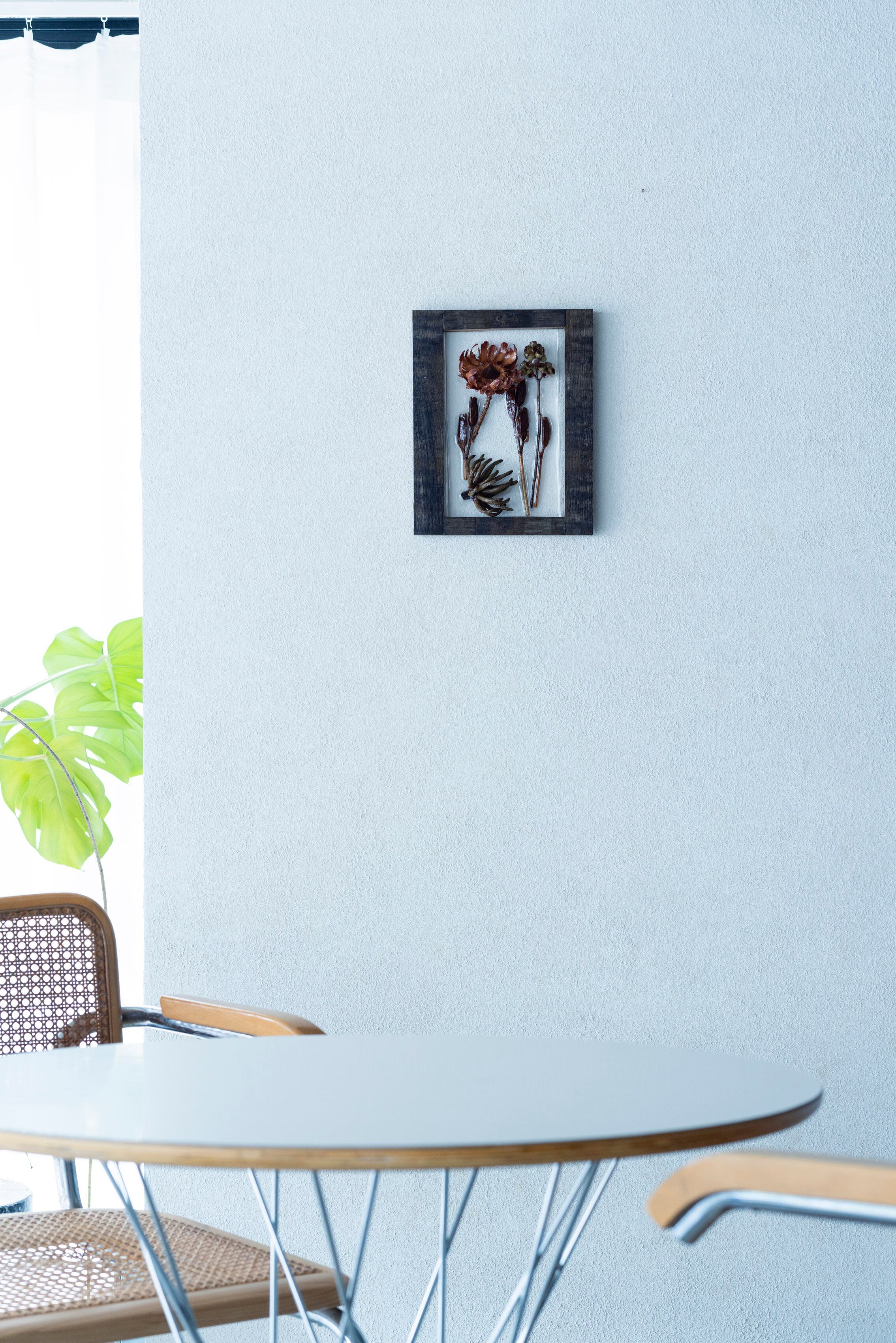 ウッドフレームの中の、ドライフラワーは花の向き、大きさにとても個性があり、表情豊かな花々ですので一番美しく見えるようにデザインして、プレート状のレジンデコールに仕上げています。